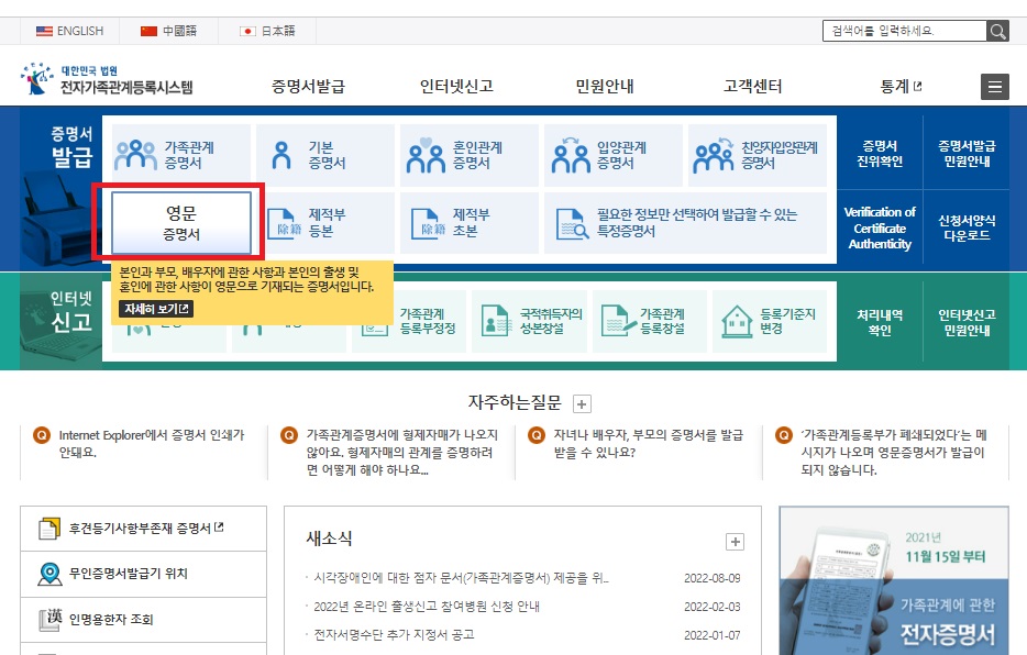 영문 가족관계 증명서 발급 방법