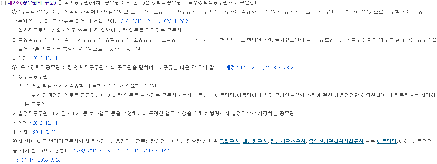 국가공무원법에 공무원의 구분에 대해서도 나옵니다. 기본적으로 경력직 공무원과 특수 경력직 공무원으로 나누며 경력직 공무원은 일반직 공무원과 특정직 공무원으로 나눕니다. 경력직 공무원은 공개경쟁방식으로 채용되어 신분이 보장되는 공무원을 말하고 특수경력직 공무원은 선거나 임명, 지정의 방식으로 채용되는 공무원을 말합니다. 일반직 공무원은 행정 일반에 대한 업무를 담당하는 공무원을 말하고 특정직 공무원은 교사, 경찰공무원, 군인, 군무원 등이 있는데 특정직 공무원은 시험요강 및 자격 요건이 별도의 법령에 의해 이루어지고 있으니 각개의 요건을 참고하셔야 합니다. 일반직 공무원의 범위 안에 수많은 직군과 직렬이 있는데 그것은 다음번에 설명하도록 하겠습니다.