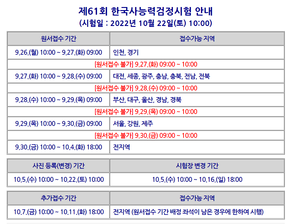 지금 접수하고 있는 61회 시험 일정의 자세한 안내입니다.