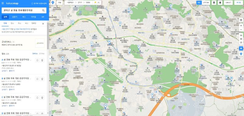네이버지도나 카카오맵 애플리케이션에 접속하거나 네이버, 다음과 같은 민간 포털사이트에 접속하여 「명절 무료 개방 주차장」을 검색하면 서비스 이용이 가능합니다. 카카오앱에서는 「설 연휴 무료 개방 공공주차장」을 검색합니다.