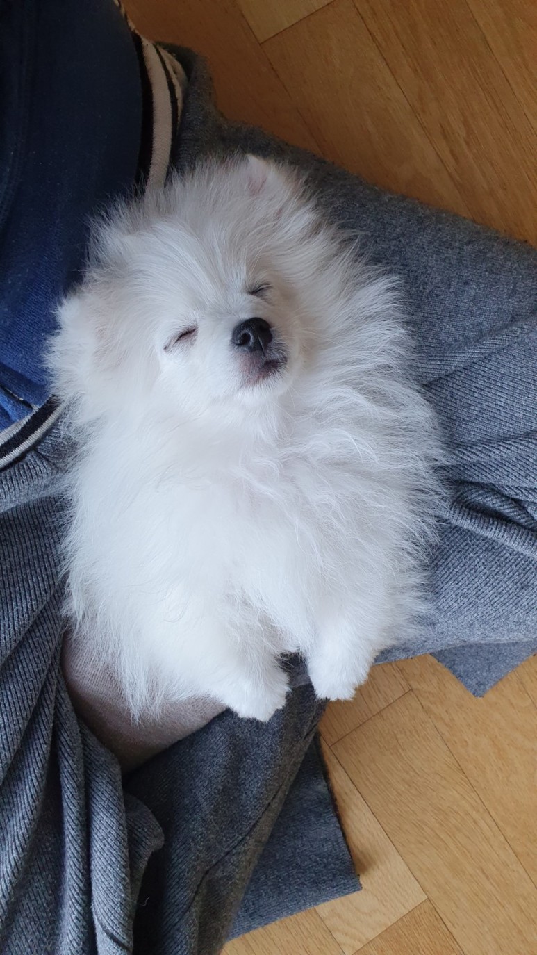 포메라니안과 폼피츠 사이에서 고민하고 있는 견주님들을 위해 3개월 폼피츠 머즐 길이 보여드리겠습니다. 아기 때 귀여움은 덤이에요~! 3개월에 몸무게가 2kg이 약간 안되었습니다. 뒤돌아서면 커져있을 때랍니다. 이때는 이가 간지러운지 앙앙, 깨물 깨물 많이 했더랬습니다. 코 자는 모습이 너무 사랑스럽지요?
