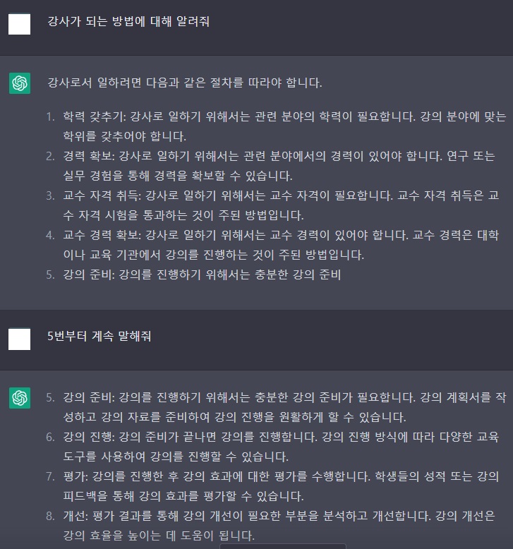 이상으로 ChatGPT에게 물어본 방과후 교사나 강사가 되는 법에 대한 답변이었습니다. 조금 뻔한 답변이긴 하지만 조금더 디테일하게 질문을 해도 대답을 잘 해줄 것으로 보입니다.