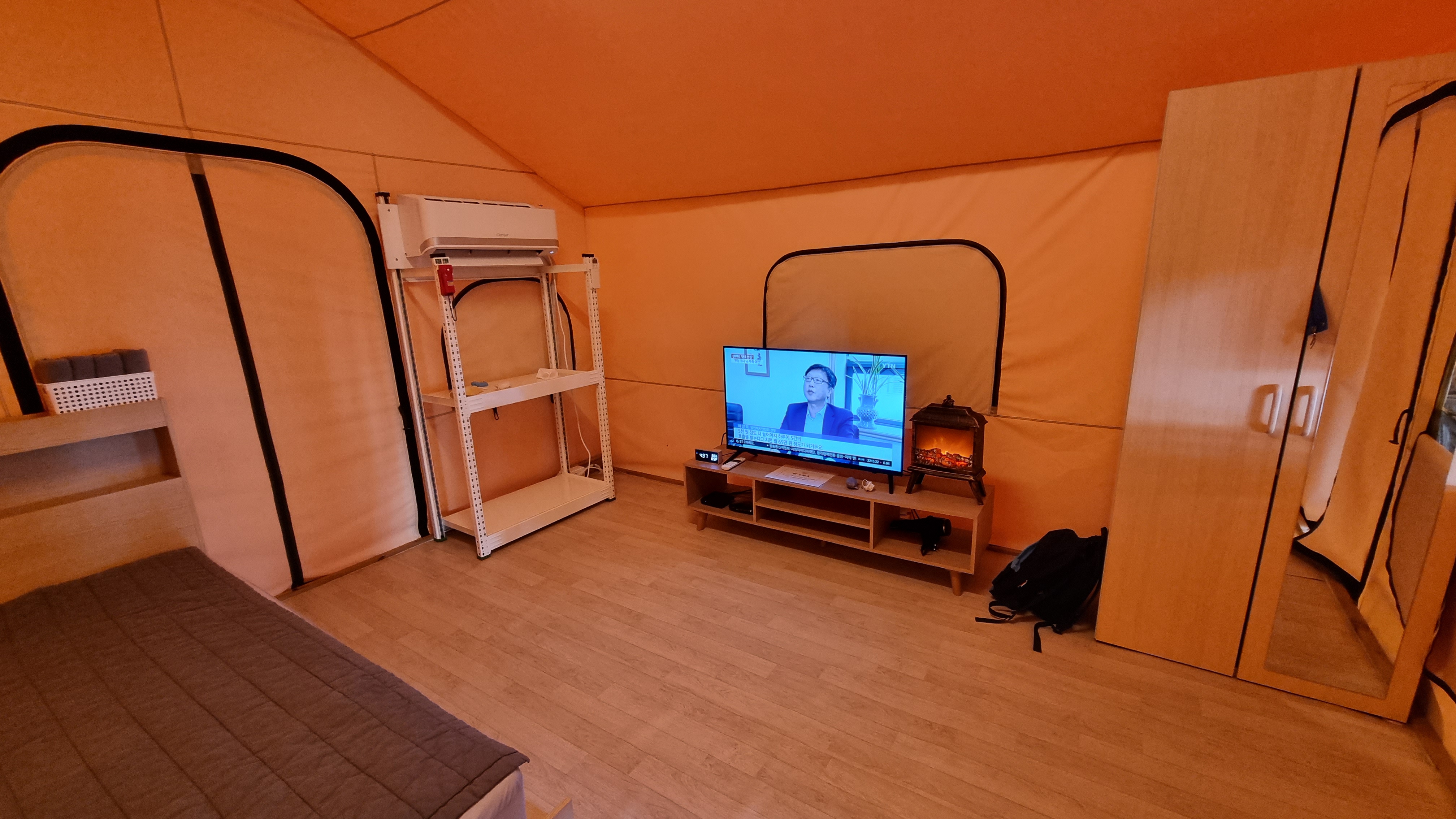 내부사진을 보여드리겠습니다. 있을만한 건 다 있습니다. 4인 가족이 잠을 잘 수 있도록 2인용 사이즈 침대와 펼치면 침대로 사용할 수 있는 소파가 있습니다. 이불과 패드는 2인용 사이즈 두 채씩 있습니다. 베개는 총 4개이고요. 에어컨은 기본으로 있고 바닥에 열선 난방 가능해서 찬바람 불어도 무리 없이 이용 가능합니다. 특이하게 텔레비전 옆에 불명할 수 있는 화로 장식품이 있습니다. 불 꺼놓고 보니 꽤 볼만합니다.