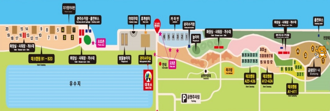 저는 사실 글램핑 4번 사이트를 예약했었는데 비 오면서 수리할 부분이 생겼나 봐요. 캠핑장 측에서 설명하시길 출입문 지퍼 부분이 수리가 필요하기 때문에 예비용으로 남겨둔 1번 사이트를 이용해 달라고 그러시더라고요. 개인적으로는 위에서 설명한 단점이 아쉬워서 4번을 예약했던 것이거든요. 4번은 텐트존과 맞닿아 있고 글램핑장 세 개 사이트가 널찍널찍 거리를 두고 나란히 있는 곳입니다. 여차저차 해서 저희는 1번 글램핑 사이트를 이용하였습니다. 결과적으로는 매우 좋았어요. 저희가 이용한 1번 사이트 위치 한번 보세요. 개수대와 화장실을 가려면 한 20미터 정도 걸어야 합니다. 그리고 안내사무소와 거리가 좀 있어서 자주 왔다 갔다 하기에는 좀 귀찮습니다. 한 100m 건너요? 써놓고 나니 부끄러운 거리긴 한데 다 까우면 좋잖아요. 요 아래 시설 안내 그림에서 보면 제일 우측이 1번 글램핑입니다. 그림에는 다 안 나왔는데 그림 왼쪽 끝으로 더 가면 여름철에 운영하는 어린이 물놀이장과 놀이터가 있습니다. 그러니 여름에 글램핑 이용하시면 아이들이랑 걸어 다니기 좀 불편하실 거예요.