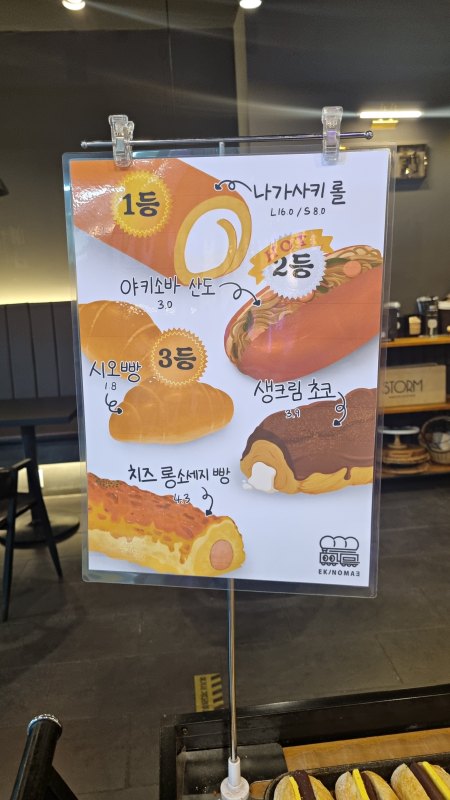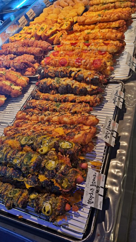빵들의 비쥬얼은 빵을 잔뜩 쌓아놓은 베이커리 카페처럼 다양한 종류의 빵들이 많이 나와 있습니다. 인기 있는 빵은 1등 나가사키롤, 2등 야키소바 산도, 3등 시오빵, 그 외에 생크림초코와 치즈 롱소시지빵이 있습니다. 롱소시지빵들은 크기가 엄청 커서 칼로리가 부담되어서 먹어보지는 않았습니다.