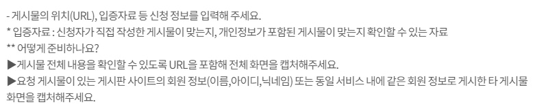 - 개인정보 수집, 이용, 제공 동의를 한 후 게시물 주소와 입증자료 등의 신청 정보를 입력하여 신청합니다.