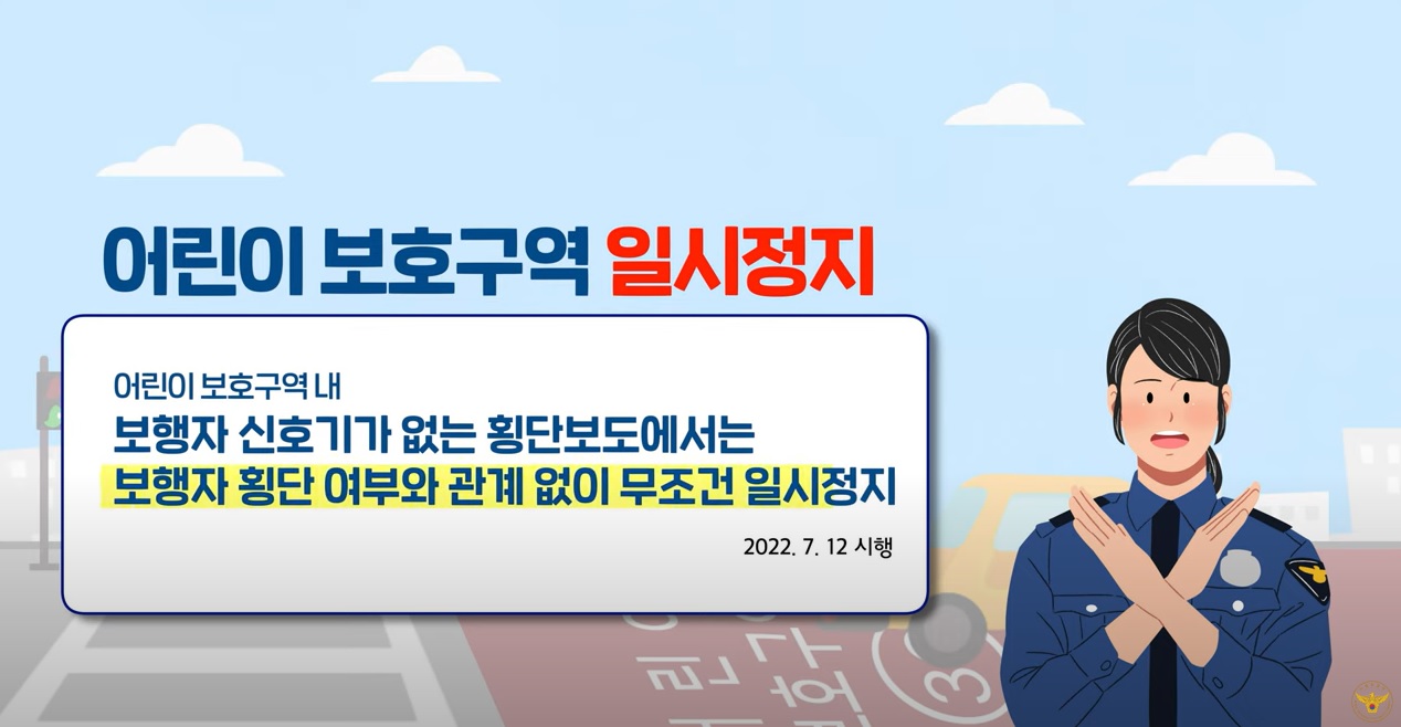 어린이 보호구역에서는 이보다 더 강화되어 보행자 횡단 여부와 관계없이 무조건 일시 정지하여야 합니다. 특히 거주지 내 어린이 보호구역은 아이들이 마음 편하게 다니는 길로 아무 때나 무방비상태로 툭툭 튀어나옵니다. 아이들의 행동 양상이 부주의한 경우가 많기 때문에 운전하는 어른이 좀 더 세심하게 주변을 살펴야 할 것 같습니다.