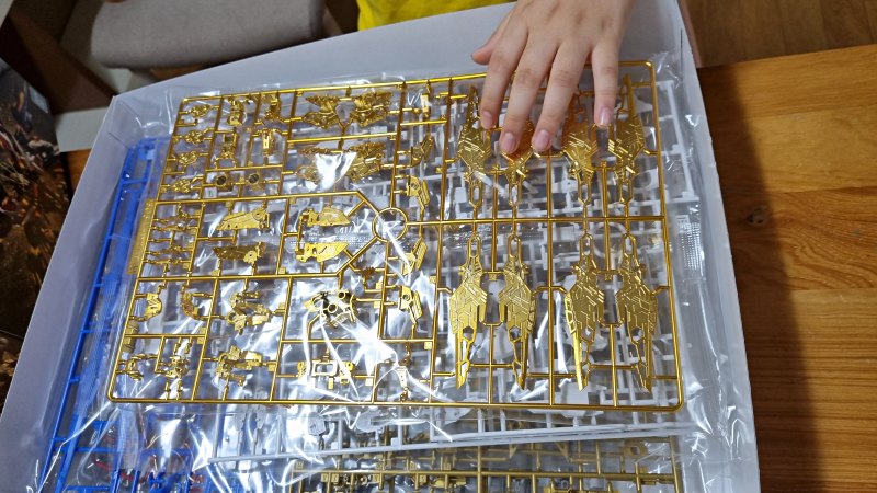 뼈대를 만드는 작업을 하는 중입니다. 내부 프레임도 금빛으로 번쩍입니다. 세 가지 금빛 코팅과 두 가지 메탈릭 성형, 애칭실에 의한 표현까지 금속감을 리얼하게 보여줄 수 있도록 건프라 역사 중 가장 심혈을 기울인 금속 표현 키트입니다. 여기서 MGEX는 EXtreme point를 극대화하여 극한 표현에 도전하는 MG의 하이엔드 브랜드입니다. 첫 번째가 발광기능을 탑재한 유니콘 건담이었지요. 그거보다는 저는 스트라이크 프리덤 건담에 한 표를 더 주고 싶습니다.