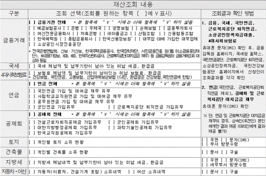 참고로 국세, 금융내역, 연금, 공제회, 4대 사회보험료 등의 조회 시에는 20일가량 소요되며, 토지, 지방세 조회는 7일, 자동차나 어선, 건축물 소유여부는 방문신청했을 경우 바로 조회가 가능합니다.