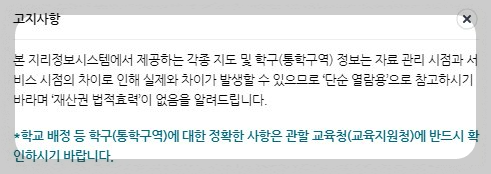 참고로 학교 신설 폐지 등을 이유로 학구도가 변경될 수 있습니다. 고시된 내용이 사이트에 반영되는데 시일이 걸리기 때문에 조회되는 정보가 정확하지 않을 수 있습니다. 이점도 유의해서 활용하시면 좋겠습니다.