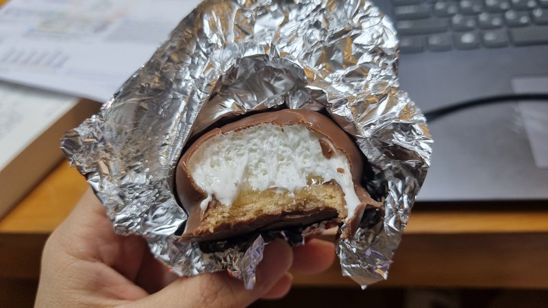 한 입 베어 물면 가득 들어있는 멜로우가 있습니다. 이 멜로우는 초코파이에 들어있는 것처럼 탄탄하고 쫄깃한 마시멜로우가 아니고 크림처럼 부드러운 상태입니다. 차갑게 보관해도 부드럽게 유지가 되더라고요. 처음에 말씀드린 대로 납작한 쇼트케이크 위에 설탕, 포도당시럽, 정제수, 난백으로 만들어진 멜로우가 가득 차있습니다.