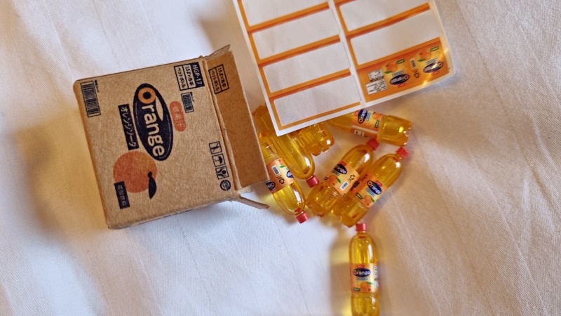 음료 박스 미니어처입니다. 박스는 종이재질도 되어있고 페트병에 스티커를 떼어 붙이는 재미있는 요소가 있는 미니어처입니다.
