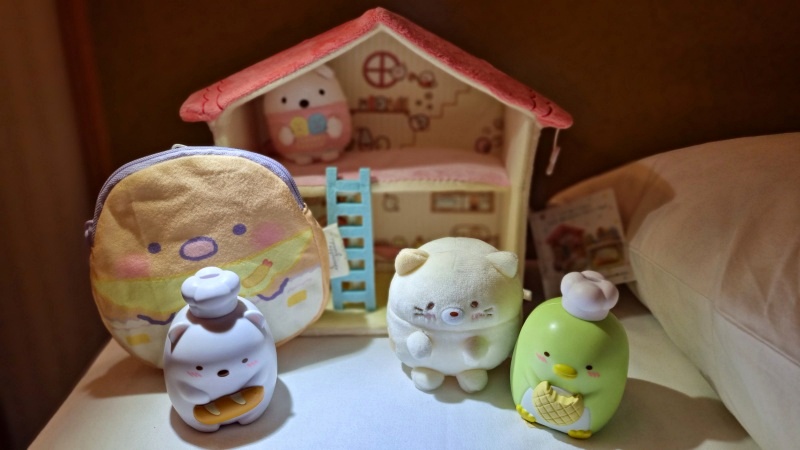 아래 사진 중에 세 가지가 가챠샵에서 뽑은 것입니다. 시로쿠마(흰색 곰), 펭귄 플라스틱 피규어와 지갑모양의 돈가스 캐릭터가 바로 그것입니다. 스미코 구라시 집과 네코 봉제인형은 캐릭터 샵 할인매대에서 구매한 것으로 작은 곰인형이 들어있는 집과 고양이 봉제인형을 합쳐서 2000엔을 주고 샀으니 가격적으로 득템이라고 생각합니다.