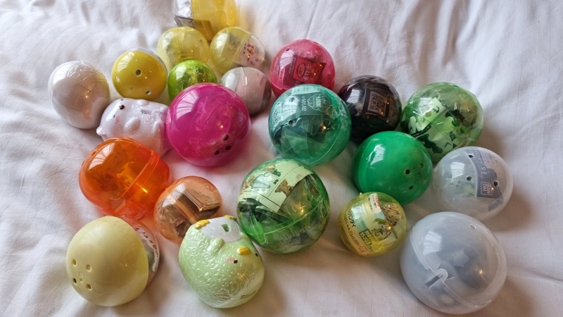 이날 뽑아온 가챠를 바로바로 풀어보도록 하겠습니다. 20개가 넘네요. 두 녀석들이 뽑은 것입니다.
