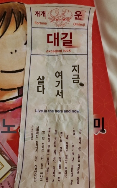 제가 산 기념품과 운세 종이입니다. 파파고 번역기로 돌려서 읽어보았는데 뭐라는 건지 잘 모르겠습니다. 대길이라니 그냥 좋은 걸로...