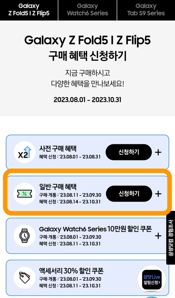 저는 장바구니 10만 원 쿠폰을 선택했어요. 2023년 9월 30일까지 새로 출시된 갤럭시 z폴드5나 z플립5를 개통한 고객을 대상으로 하는 이벤트입니다. 이 10만 원 쿠폰으로 핸드폰 케이스를 비롯한 액세서리나 갤럭시 버즈 2, 충전기, 스피커 같은 제품들을 구매할 수 있답니다.