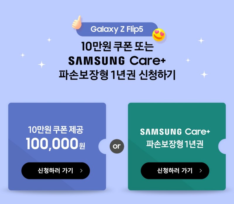 최근 갤럭시 z플립5로 핸드폰을 바꿨답니다. 사전예약으로 구매했던 것은 아니고 그 이후에 전면부 스크린에 반해서 뒤늦게 구매를 한 케이스랍니다. 저처럼 일반구매자들에게는 삼성닷컴에서 사용할 수 있는 10만 원 쿠폰을 제공받거나 1년간 samsung care + 파손 보장을 받는 서비스 중 하나를 선택할 수 있어요.