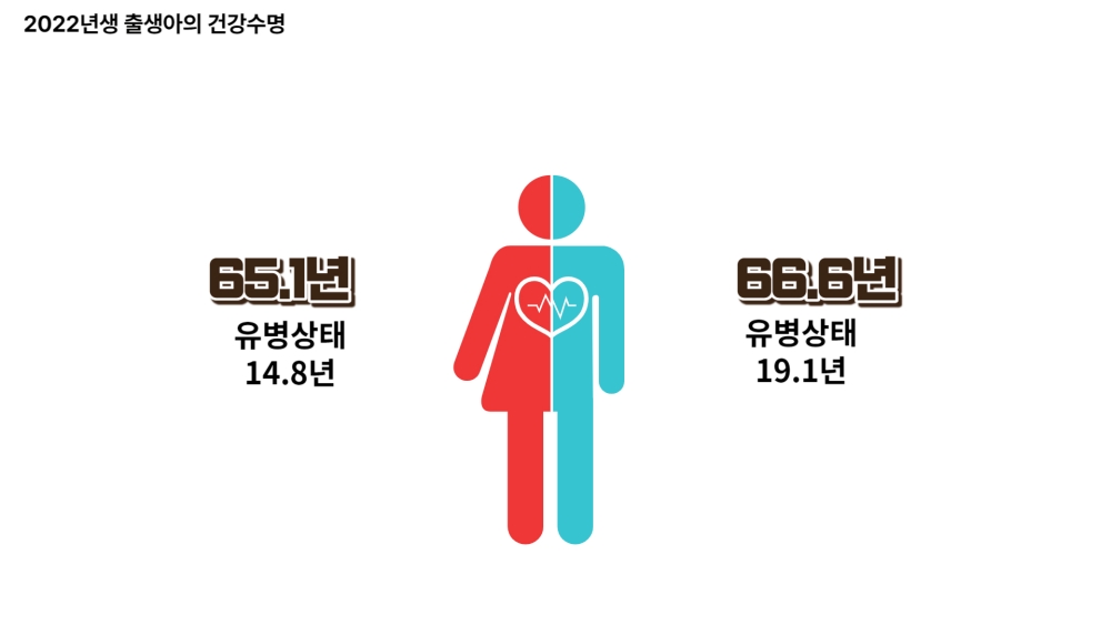 그렇다면 2022년에 출생한 아이들은 앞으로 몇 살까지 건강하게 살 수 있을까요? 통계청의 발표를 참고하면 남자는 65.1년, 여자는 66.6년이라고 합니다. 이 결과에서 유병상태로 보내는 기간은 남자 14.8년, 여자 19.1년으로 여자가 더 길다는 것을 확인할 수 있습니다.