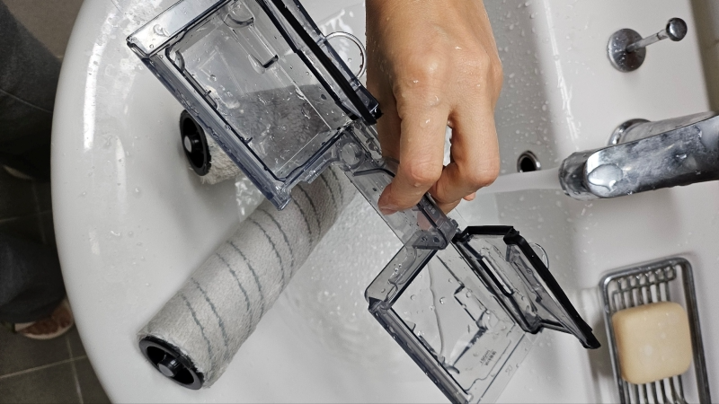 이 제품의 또 하나의 장점은 간편 세척이 된다는 점이에요. 중간에 사용하다가 새까매진 걸레를 계속 사용해야 하나 세척해야 하나 고민될때가 있으실거에요. 이때 사용하면 좋은 기능이랍니다. 걸레가 있는 곳의 커버를 벗겨내면 오수통이 들어있어요. 여기에 물이 상당부분 차있을테니까 일단 버리고 다시 장착을 합니다.